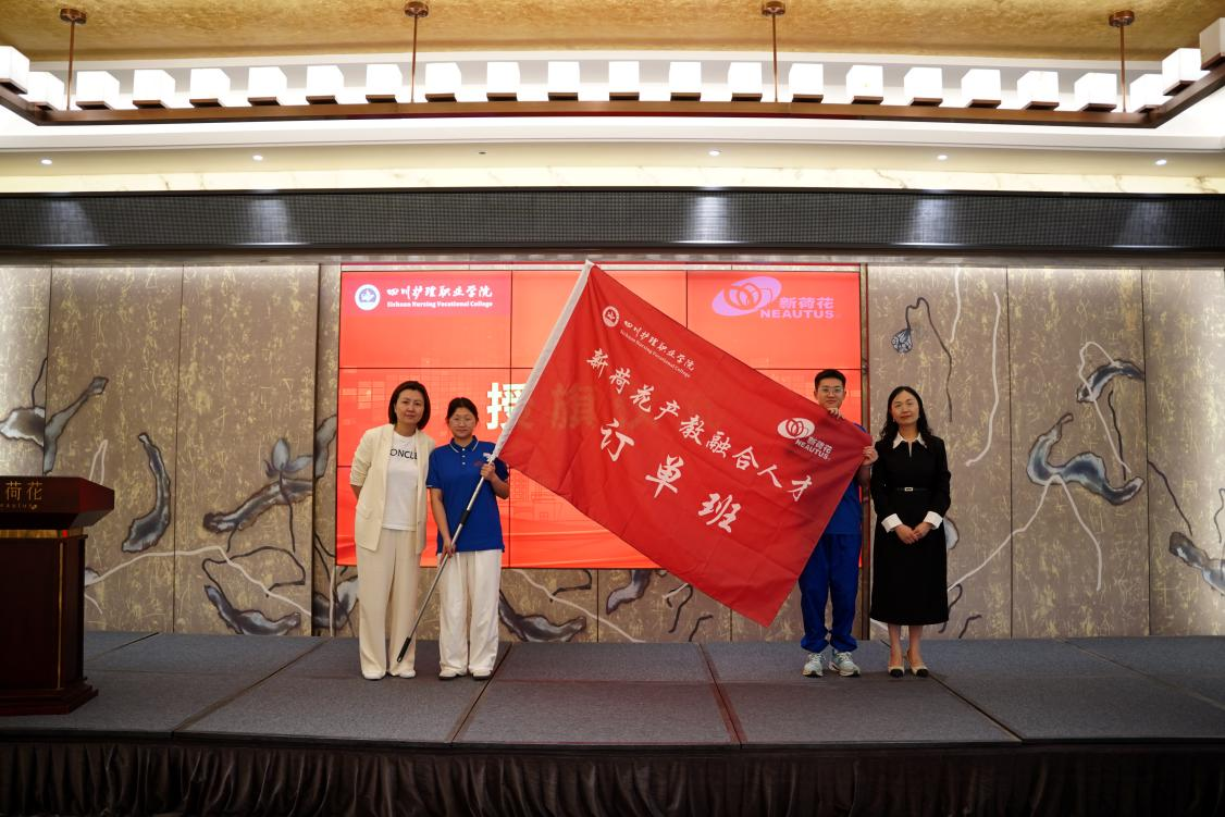 随后校企双方领导为“新荷花产教融合人才订单班”授予班旗。订单班班长宁茂林作代表发言,表示将以饱满的热情投入学习,以严谨的态度对待每一次实践,用扎实的专业本领回应学校与企业的殷切期望。