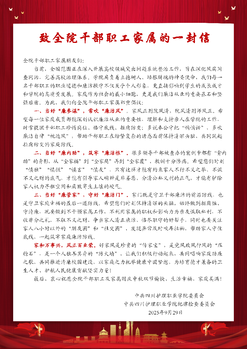 学院从讲政治的高度压紧责任链条,要求全院干部职工始终牢记落实中央八项规定精神是长期有效的铁规矩、硬杠杠,持续做实教育提醒,加强监督检查。从家风建设入手,以优良家风涵养清朗作风,为全院干部职工及家属发送了一封承载着学院关怀与殷殷嘱托的廉政家书,旨在以“家”之力,弘扬廉洁之风,共筑拒腐防变的坚固堤坝。