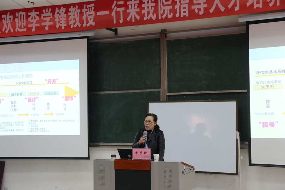 3月30日下午,高职教育评估专家、国家级教学名师李学锋教授及其团队来我院作人才培养工作评估的专题培训会。张先庚院长、陈劲松副院长、姚永萍副院长、全体中层干部、专兼职教师、辅导员等近200人参加了培训会。会议由姚永萍副院长主持。