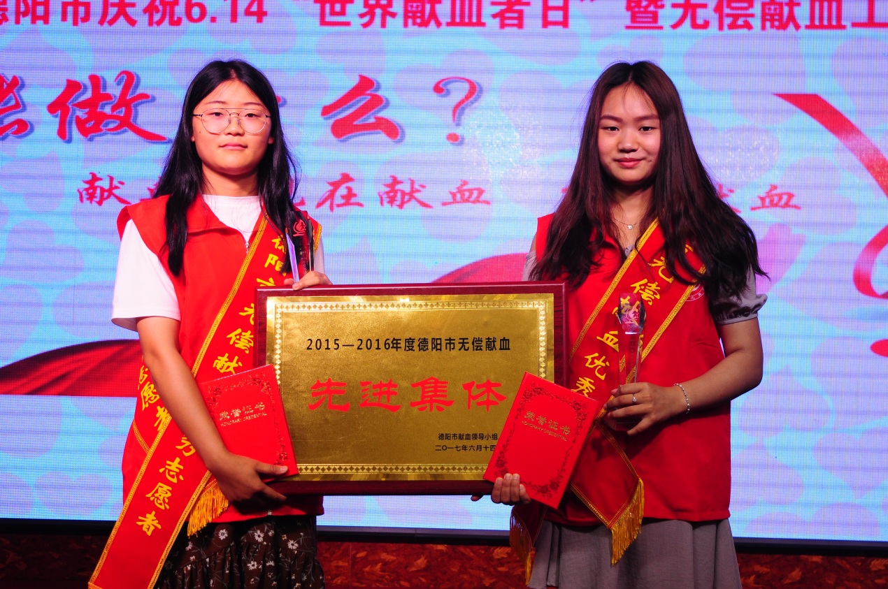 6月14日,由德阳市献血领导小组办公室主办的庆祝“6.14世界献血者日”暨无偿献血先进表彰大会在德阳市晶熙酒店二楼金色大厅召开。我院荣获“2015-2016年度全市无偿献血先进集体奖”,这也是我院第一次获得该项荣誉。同时我院青年志愿者邓荣莲同学和罗心怡同学作为优秀青年志愿者代表受到了表彰。