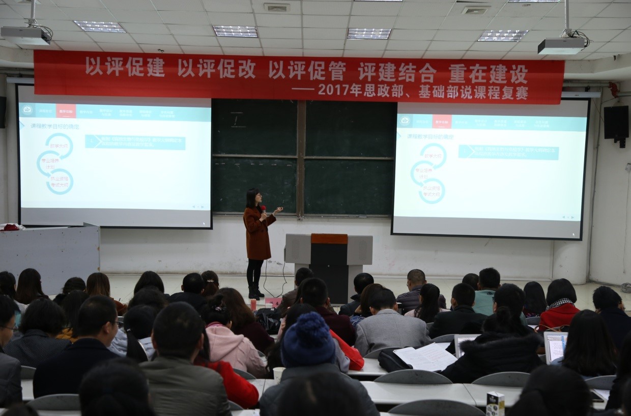 为认真做好2018年评估准备工作,继续深化教育教学改革,推进课程改革与建设,提升教师自身业务能力与水平,根据学院教学工作总体安排,2017年10月至11月初,思政部、基础部的思政教研室、文化基础教研室等9个教研室先后开展了说课程初赛。经过经过选拔脱颖而出的17名老师将代表各自的教研室参加说课程复赛。