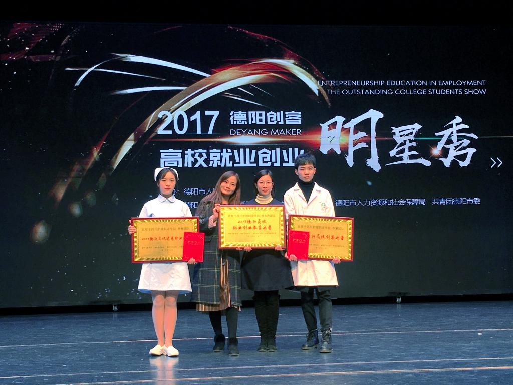 12月21日,由德阳市教育局、德阳市人力资源和社会保障局、德阳市科学技术和知识产权局以及共青团德阳市委共同举办的“德阳创客 高校就业创业明星秀”活动在德阳市演艺中心举行。我院姚永萍、王建鹏、王景、李汐睿、刘四顺创新创业教学团队荣获德阳市“就业创业教育之星”称号,护理系杨彬学生创业团队荣获“未来职业之星”称号,医康系李蒙学生创业团队荣获“创客之星”称号。