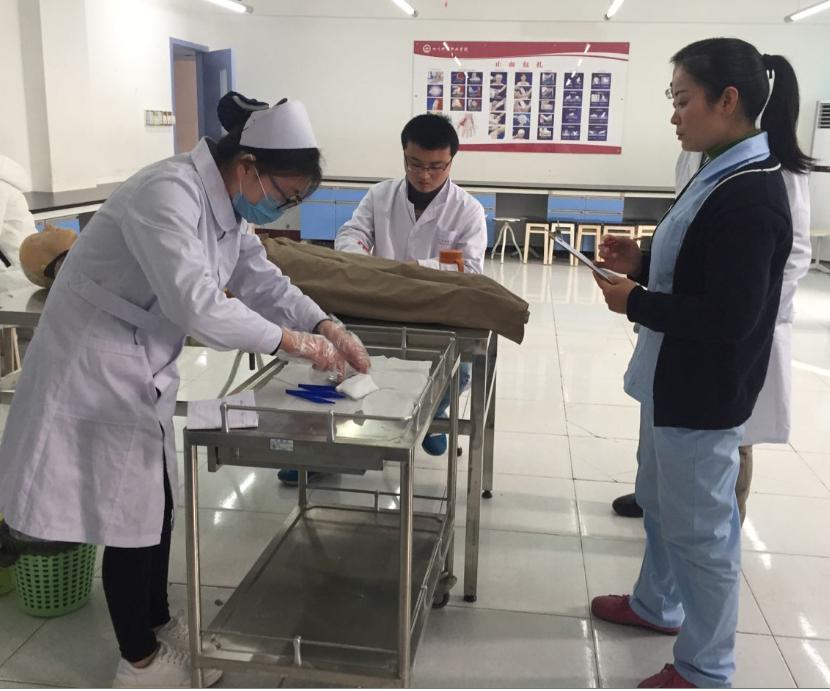 考核之前护理系制定了技能考核方案与规程。本次考核将理论与操作相结合,被试学生从内科护理与外科护理相结合的病案中抽取1个病例进行案例分析,然后参与技能操作考试。老师们严格按照操作程序及考核标准,从基本素质、评估病人、操作步骤、综合评价等几个方面对学生进行了细致、严格的评分考核。
