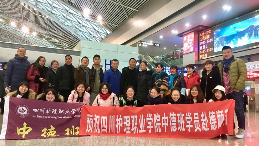 2018年1月3日,2016级9名中德养老护理班学生在成都双流机场齐聚,统一前往德国汉堡,开启新的学习工作旅程。