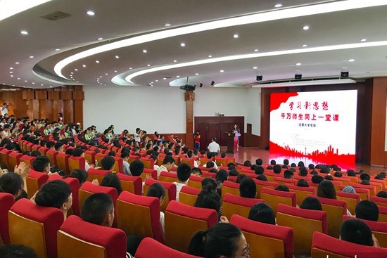 6月19日下午,我院30余名师生共赴成都大学,与其他8所兄弟院校齐聚一堂,共同聆听“学习新思想 千万师生同上一堂课”专场思政大课。成都大学党委书记罗波、四川师范大学副校长高中伟、电子科技大学辅导员江倩担任主讲人。他们围绕习近平总书记在北京大学师生座谈会和纪念马克思诞辰200周年大会上重要讲话精神的丰富内涵和精神实质进行宣讲授课。