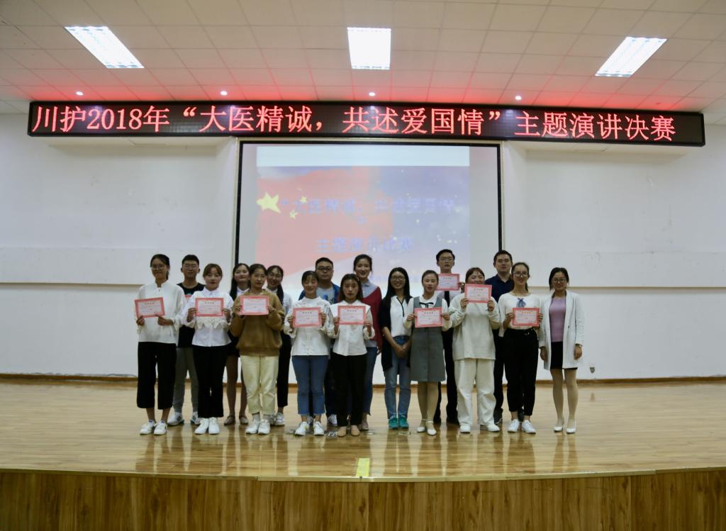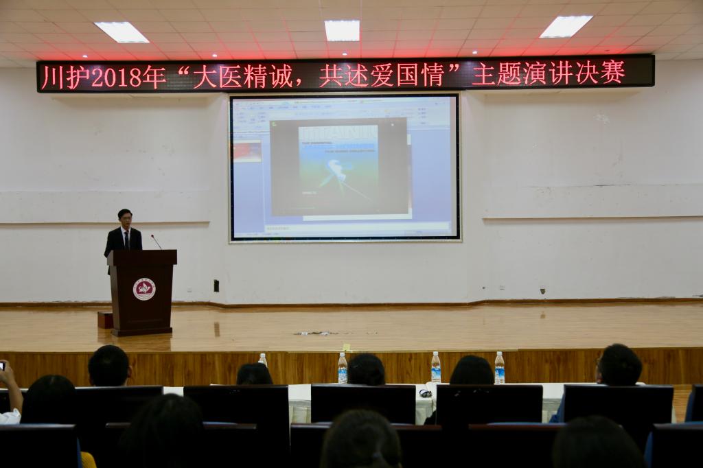 为进一步弘扬爱国主义精神,丰富校园文化生活,激发我校教师热爱祖国、热爱党、热爱家乡的情感,激励广大学生关心国防、热爱国防、建设国防、保卫国防的热情,9月27日晚,我院 “大医精诚,共述爱国情”主题演讲比赛决赛在德阳校区学术报告厅举办,共有300余名学生观赛。