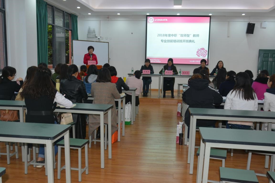 2018年11月5日上午,2018年“四川省职业院校教师素质提高计划 -‘双师型’教师专业技能培训班”开班仪式在学院成都校区举行。此次培训班由我院承办,来自全省13所中职院校的23名教师参加。学院院长张先庚、副院长姚永萍、实训继教部和护理系主要负责同志出席开班仪式。开班仪式由姚永萍副院长主持。