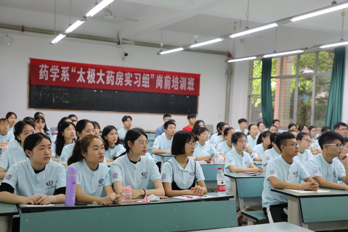 5月25日上午,“太极大药房实习组”岗前培训班在龙泉校区开班,药学系即将在太极大药房实习的全体同学参加开班仪式。