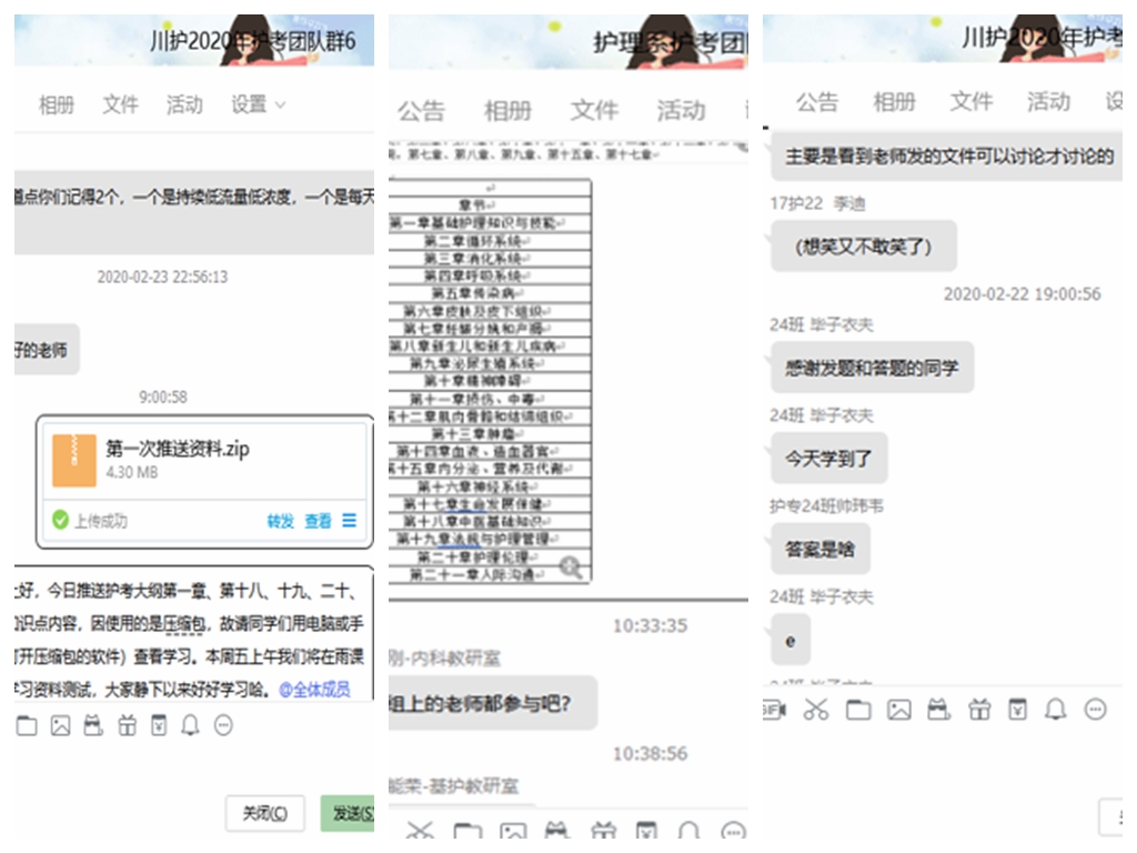 今年护理系为护考学生开建了多个护考QQ群,每群配以辅导员老师和专业教师对学生进行管理,学生在群内积极提问、相互讨论,学习氛围浓厚,展现了川护学子求知若渴的良好学风。相信在我院领导指导和支持下,通过护理系教师的共同努力和学生的勤恳学习,我院今年护考工作一定会取得优异成绩!