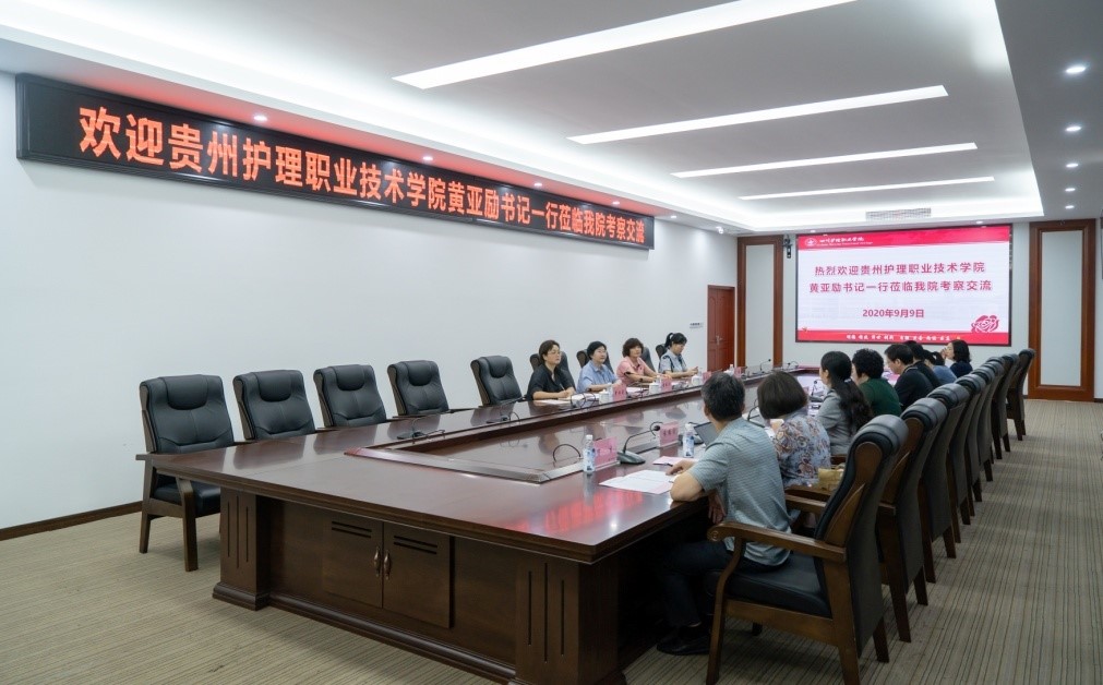 2020年9月9日,贵州护理职业技术学院党委书记黄亚励一行4人到我院考察交流。学院党委书记江涛、院长张先庚,副院长陈劲松、姚永萍及相关部门负责人陪同参加了考察交流活动。