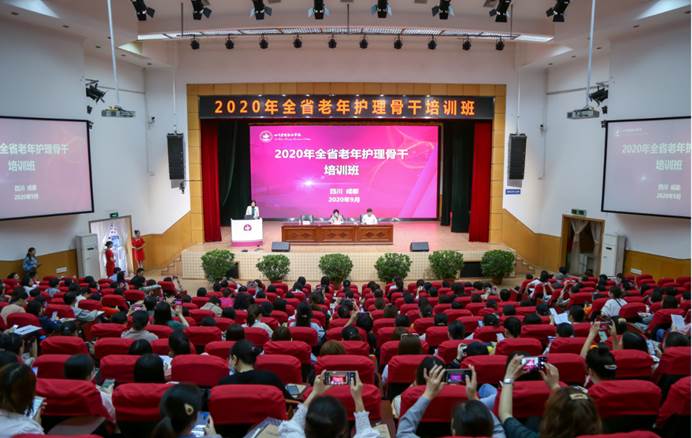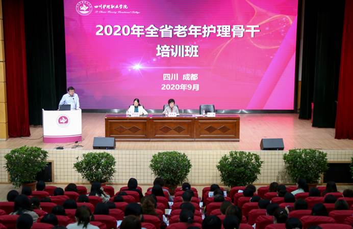 为贯彻落实省卫生健康委等10部门《关于建立完善老年健康服务体系的实施意见》精神,加强老年医学科建设,丰富老年护理服务内涵,提升老年护理服务质量,2020年9月24日上午,由beat365官方网站承办的“2020年全省老年护理骨干培训班”开班典礼在beat365官方网站学术报告厅隆重举行。四川省卫生健康委老龄健康处副处长李磊、四级主任科员谢伟、学院院长张先庚、副院长姚永萍、健康培训中心负责人和来自全省21个市(州)的201名老年护理骨干参加了典礼。典礼由姚永萍副院长主持。