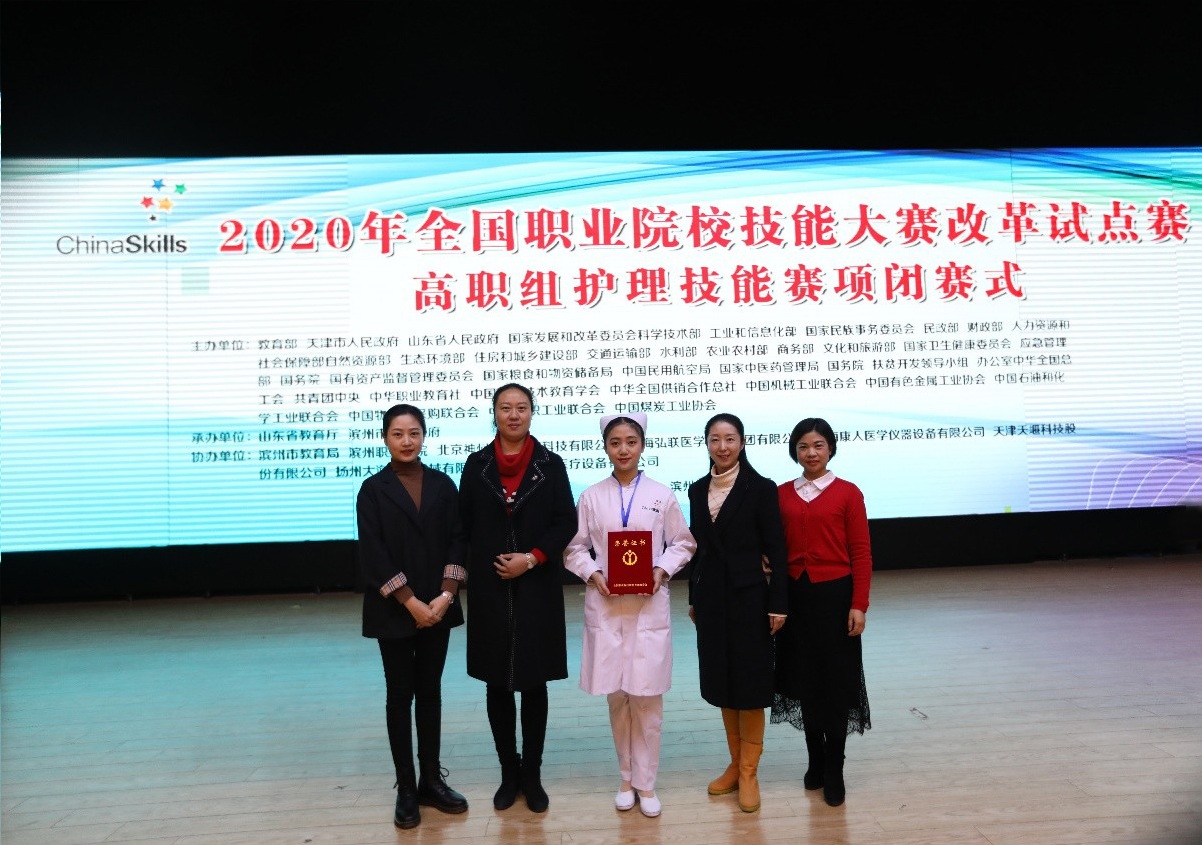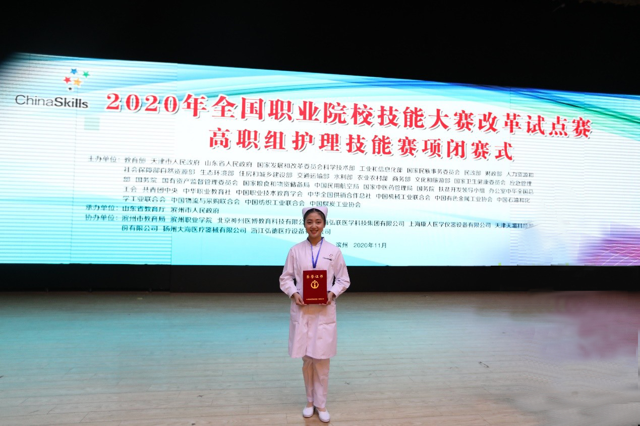 11月27日至28日,2020年全国职业院校技能大赛改革试点赛高职组护理技能赛项在山东滨州职业学院隆重举行。我院黄榕同学凭借扎实的理论知识、娴熟的操作技能、良好的综合素质,赢得了评委专家们的肯定,在大赛中获得二等奖。