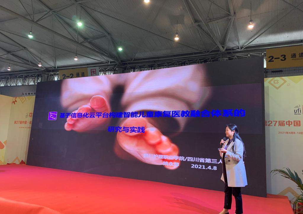 姚院长作题为《基于信息化云平台建设构建智能儿童康复医教融合体系的研究与实践》的专题报告。她以脑瘫患儿的康复治疗为切入点,从项目背景、研究过程、重点实验室建设及发展等方面进行了分享。她谈到,脑瘫患者的精准康复治疗是一个亟待解决的临床问题,而人才缺乏是其中的关键。目前,学院正立足社会需求和人才培养目标,带领“双师型”教师团队,以“互联网+”大学生创新创业项目为抓手,积极探索政、行、企、校“四位一体”的人才培养体制机制,在高职类儿童康复方向人才培养、四川省儿童康复智能工程实验室建设、科研转化等方面,做了大量的应用研究,并在重点研究内容方面积极创新,形成细分方向的建设思路。姚院长介绍了“医-教-研-产”全程化的模式在儿童康复专业实际应用取得的成效。在介绍踝足矫形器研发项目时,她说,矫形器是整合医疗、生物工程、互联网+等多学科交叉,且面向基层、残联、家庭的人机交互智能产品。产品以“一体两翼”为核心,搭载人工智能的云平台服务,引入云端数据进行监测,开展临床注册和临床试验,使整个康复过程交互、智能、可视。该矫形器在近一年的常态化疫情防控期间,为脑瘫患儿的居家康复提供行之有效的解决方案,取得了可喜业绩。她表示,团队成员将以人才培养为初心,以社会服务为使命,稳定持续地研究和推动专业建设向前发展。