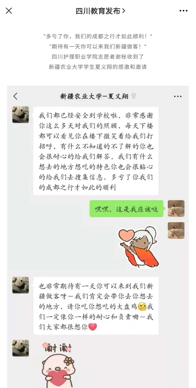 新疆师生团队发给学院志愿者的感谢信息被四川省教育厅5月14日官微宣传报道