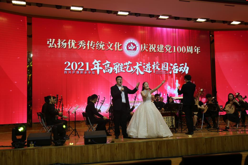 活动中,30余名乐团演职人员用他们精湛的技艺、强烈的表现力为川护师生带来了一场艺术盛宴。《金蛇狂舞》《彩云追月》《春江花月夜》《茉莉花》等器乐合奏让人领略了不同乐器在听觉上带来的享受;重奏《雪落下的声音》《九儿》让人们惊叹演奏者之间高度的默契和相互配合;《十送红军》《我的祖国》《唱支山歌给党听》等声乐表演展现了国家在中国共产党的指引下蒸蒸日上的繁荣景象。此次活动以高雅艺术进校园为教育载体,将高雅艺术融入校园文化建设和学生思想政治教育中,在提高学生艺术素养的同时,也激励广大师生增强爱国之情,砥砺强国之志,实践报国之行。