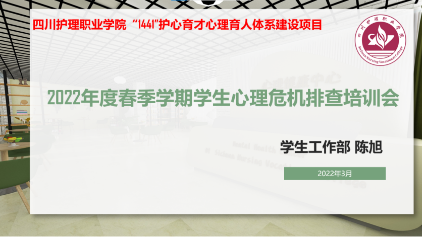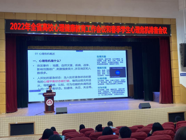 为全面落实立德树人根本任务,深入贯彻教育部办公厅《关于加强学生心理健康管理工作的通知》(教思政厅函〔2021〕10号)文件精神,全面推进学院“护心育才”1441心理育人体系建设项目,加强学工队伍对大学生心理危机干预工作的科学性和规范性,提升队伍的专业化水平,3月18日,学生工作部在成都、德阳两校区线上线下同步开展了2022年度春季学生心理危机排查培训会。各系书记、学工管理老师、专兼职辅导员和心理健康教育老师共计60余人参加。本次培训由学校心理健康教师、国家二级心理咨询师陈旭主讲。