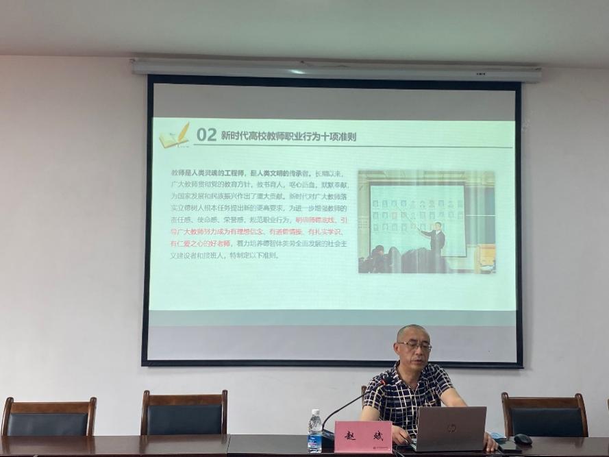 主题教育党课上,赵斌副院长结合教育部关于教师的“六禁令”和“红七条”,带领全体教师学习了《新时代高校教师职业行为十项准则》《beat365官方网站师风师德考核办法》等文件精神。同时,赵院长还以相关典型案例为反面教材,深入浅出地为全体教师进行了讲解,进一步明确了师德的“红线”和“底线”。赵院长要求全体教师要从案例中汲取教训,坚守为党育人、为国育才的初心,牢记教师的职责和使命,加强师德师风修养,不断完善自我,争做“四有好老师”“四个引路人”和“时代大先生”。