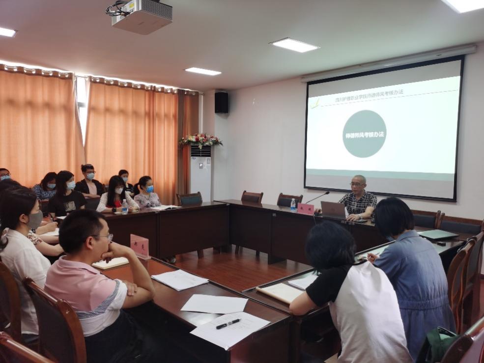 为贯彻落实习近平总书记关于教育、教师工作的重要论述精神,进一步加强部门教职工思想政治和师德师风建设,5月10日下午,学院党委委员、副院长赵斌在成都校区为康复技术系全体教职工讲授《师爱为魂 学高为师 身正为范 做党和人民满意的教师》主题教育党课。康复技术系党总支书记黄萍、主任陈燕彬、副主任郑爽及全体教师参加学习。会议由党总支书记黄萍主持。