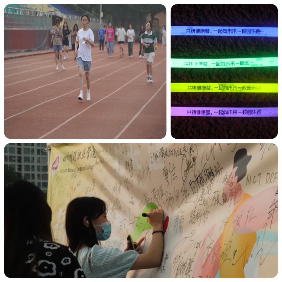 美丽的心灵和健康的体魄同等重要,首场校园乐跑活动在川护田径场开跑,200多名学生佩戴印有“共铸健康梦,一起向未来”的荧光手环,用奔跑开启最炫酷的旅程,点点荧光像天上的繁星在校园里闪烁欢快的节奏、点燃的热情。很多学生 谈到“这是我们参加过的最特别的跑步,让我们走出寝室,享受运动的畅快,也增强了身体免疫力和缓解了心理压力”。