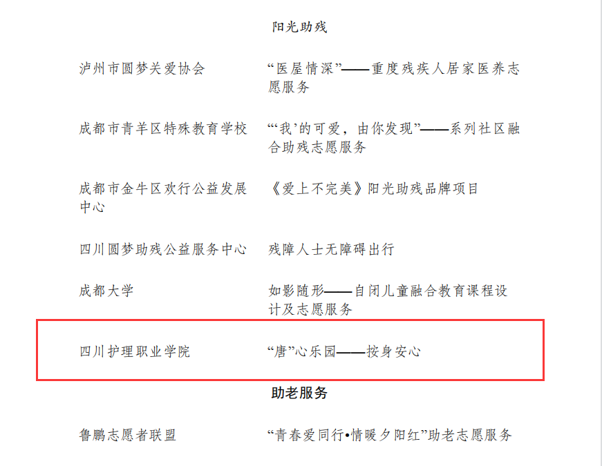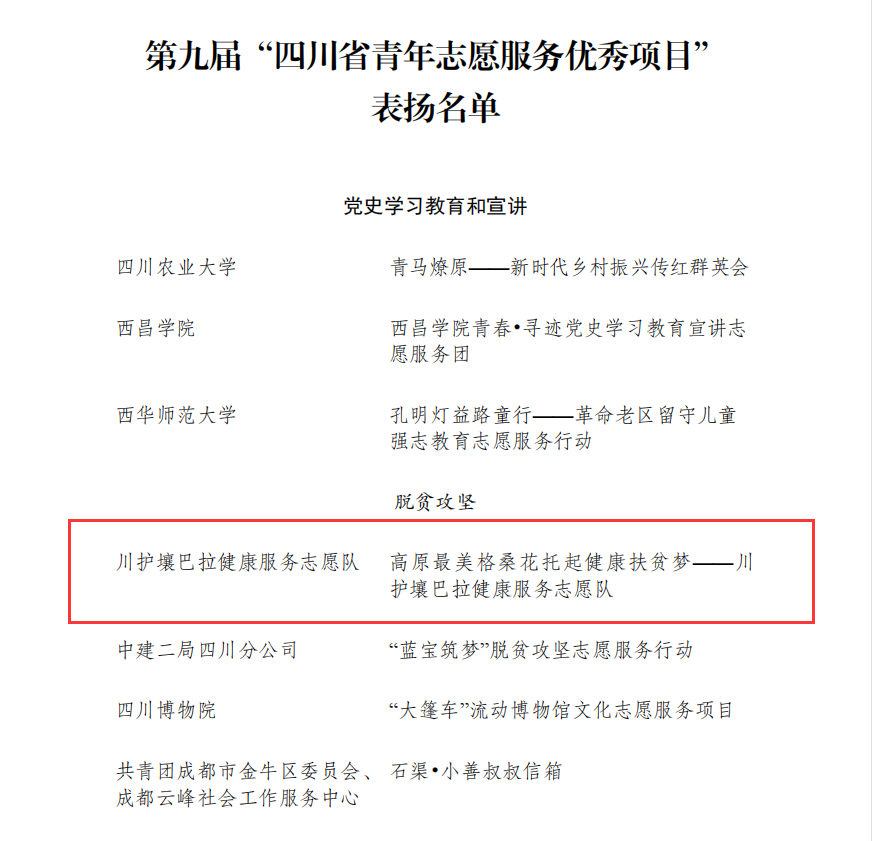 近日,共青团四川省委、四川省精神文明建设办公室、四川省民政厅公布第九届四川省青年志愿服务优秀项目名单,我院“高原最美格桑花托起健康扶贫梦——川护壤巴拉健康服务志愿队”、“‘唐’心乐园——按身安心”两个志愿服务项目获评四川省青年志愿服务优秀项目。