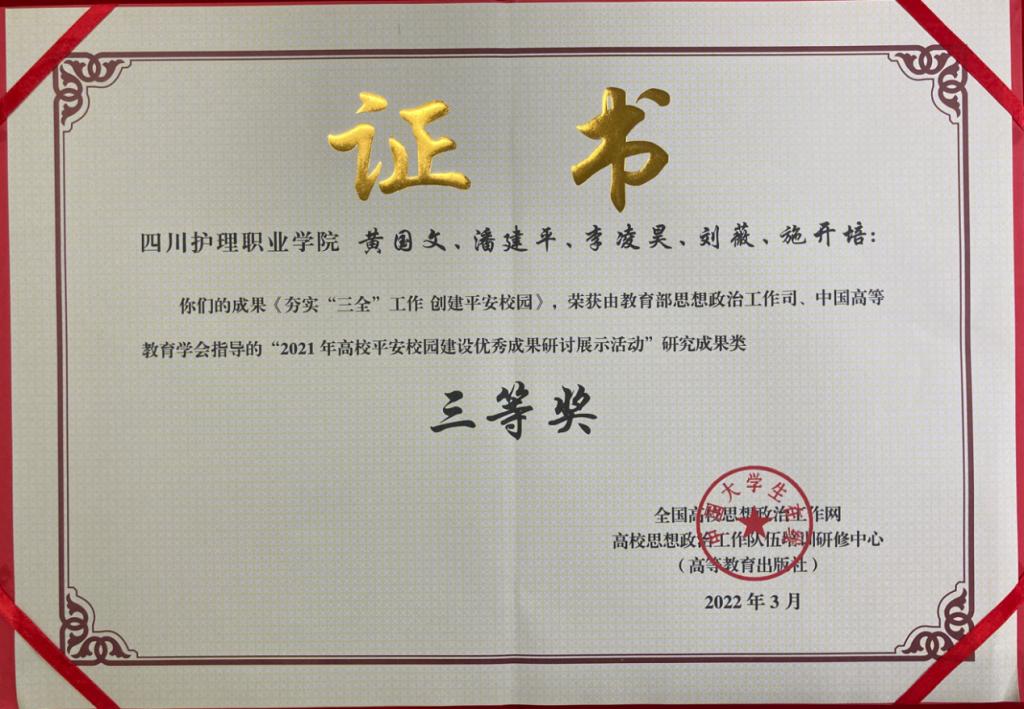 在2021年高校平安校园建设优秀成果研讨展示活动中,学院申报的《夯实“三全”工作 创建平安校园》获研究成果三等奖,这是我院平安校园建设研究成果首次获全国奖项。