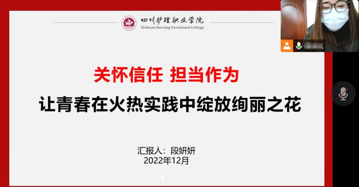 为深入学习宣传贯彻党的二十大精神,加强各级团组织规范化建设,更好履行新时代共青团职责使命,12月22日,学院团委在成都校区线上线下同步开展2022年度共青团工作述职报告会。学院党委委员、副院长陈劲松出席会议,学工部、各系负责人担任评委进行现场打分,学院团委书记段妍妍及各系团总支书记现场述职。会议由学生工作部副部长(主持工作)申洋主持。
