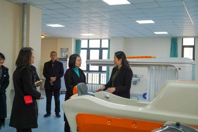 谢飞局长一行深入护理实训大楼参观学院健康技术技能馆,重点考察了护理系陈列室、内外科、儿科、母婴、老年照护和婴幼儿托育等实训室,详细了解实训室设施设备和学生实训课程开展情况,对学院护理虚拟仿真实训基地建设和高技能人才培训实训室给予高度评价。