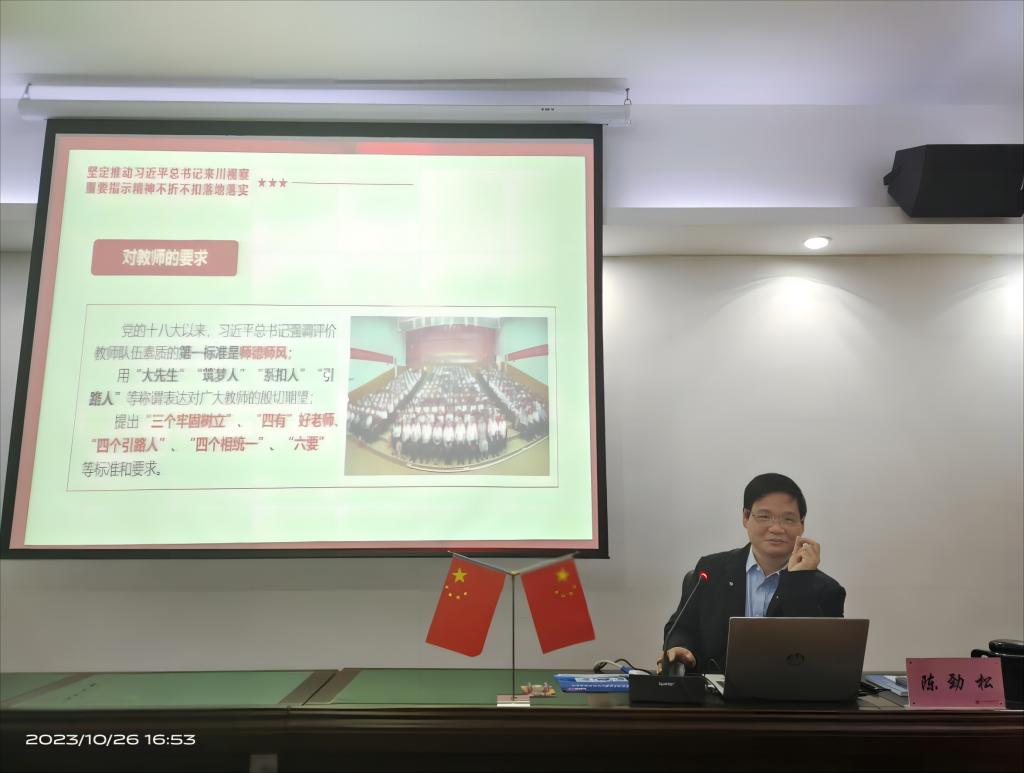 陈劲松以“牢记嘱托 感恩奋进 在中国式现代化的四川篇章中贡献川护力量”为题,从深刻领会习近平总书记来川视察的重大意义、对四川的深切关怀、为四川作出的战略擘画、提出“四个发力”的重要要求、文化传承发展的重要要求、对主题教育的最新部署等方面作了系统阐释和深入解读。并从当前国际国内形势的宏阔视野,结合学院实际情况深入剖析科技创新与成果转化、“一老一小”服务体系、重大项目建设、健康扶贫与乡村振兴、校园生态环境治理等方面取得的成效与存在的问题。