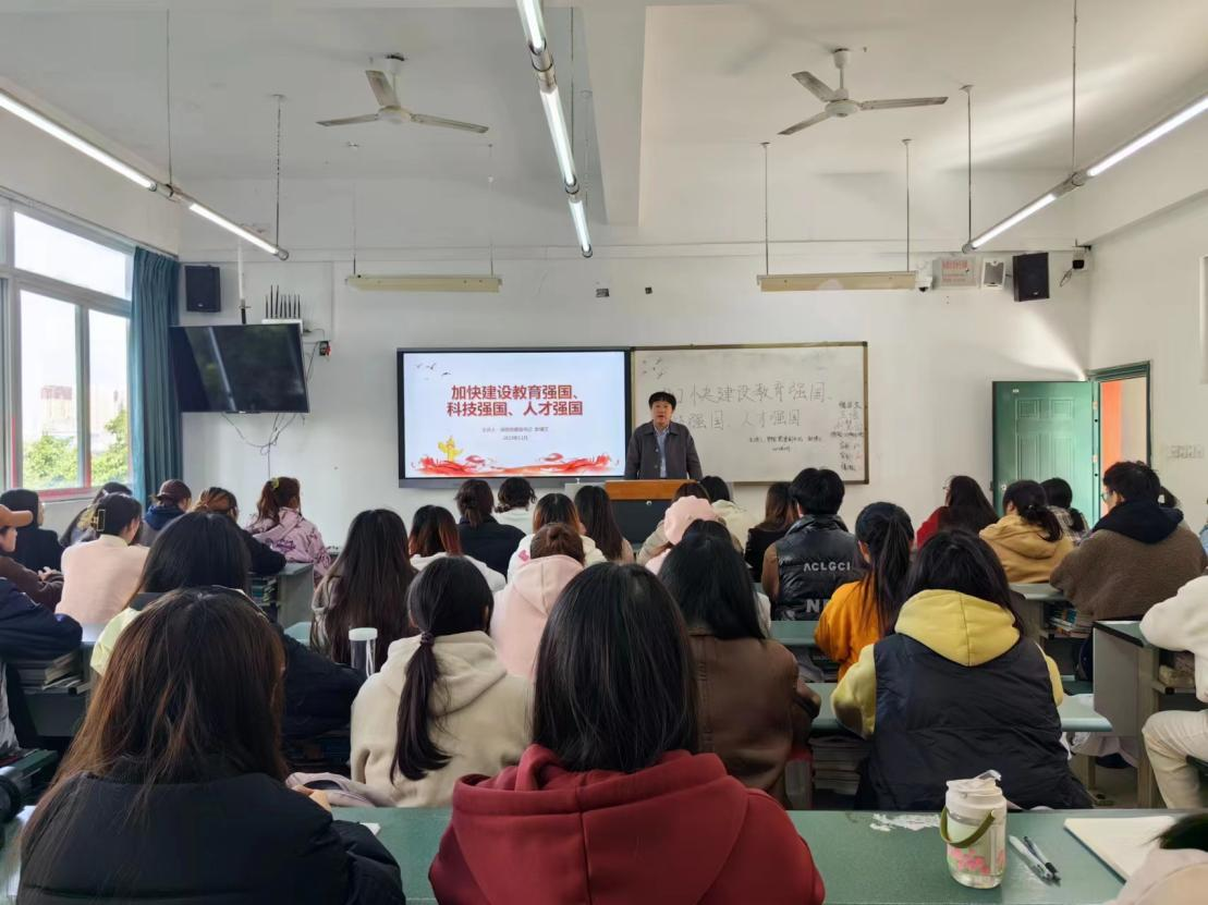 彭博文副书记以“加快建设教育强国、科技强国、人才强国”为题,系统讲述“教育、科技、人才”三大战略一体规划的重大地位和历史意义,深入浅出阐释教育、科技、人才是全面建设社会主义现代化国家的基础性、战略性支撑,推进中国式现代化建设要积极主动贯彻落实国家重大战略。他结合大健康产业发展实例,运用图文、数据等,讲解国家在教育、科技、人才方面取得的历史性成就,同时也指出在发展不平衡不充分方面,推进高质量发展还有许多卡点瓶颈,科技创新能力还不强等问题和困难,帮助同学们进一步认识我国政治、经济、教育、科技等发展状况,理解新时代青年肩上的历史重任,时代使命。