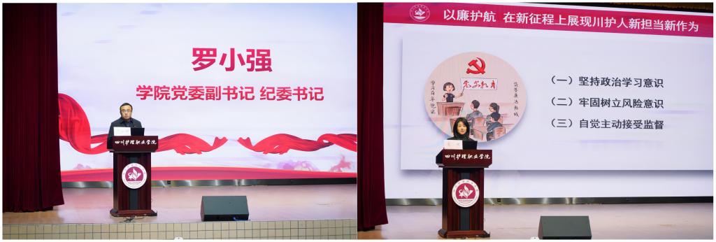 第一阶段为廉政专题培训。学院纪委副书记、纪委办公室主任肖丽以“以廉护航 在新征程上展现川护人新担当新作为”为题进行专题培训,她从当前廉政建设的总体形势、准确认识任务和挑战、做学高身正的川护人三个方面,围绕“六个纪律”、师德师风典型案例并结合学院工作实际,开展党风廉政警示教育课。