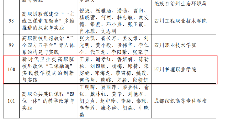 学院教师高质量开展思政课题研究,近五年来主持省部级课题1项,厅局级课题10余项,在省级及以上期刊发表论文100余篇,其中“西部民族地区基层医药卫生人才‘四方协同、三融三接’培养体系创新与实践”获2022年职教国家级教学成果奖二等奖,“新时代卫生类高职院校思政课‘三课融通’实践教学模式的创新与实践”获省级教学成果奖二等奖;学院心理育人、实践育人、文化育人和网络育人项目均获评四川省高校思想政治工作精品项目。思政教师担任全国思想道德建设专业委员会理事成员、四川省精神(卫生)心理专家库成员、四川省心理协会高校心理健康教育专委会委员共计10余人次。成功承办成都职业技术院校思想政治理论课教学研究会常务理事会,并入选理事会单位。