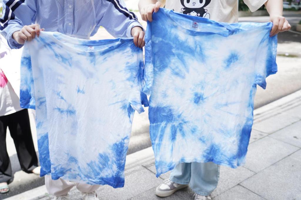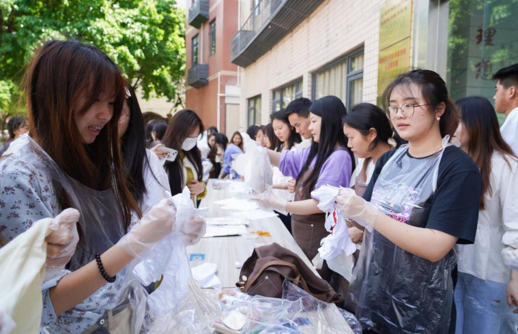 在扎染体验区,学生们构思自己喜欢的形状和图案,用橡皮筋将手帕捆扎成形状各异的“小怪兽”“小花朵”,将捆扎好的手帕放在冷水里浸泡沾湿,再浸入染料水中进行染色,各具特色的扎染手帕便完成了。大家不仅学习了扎染的基本技艺,还在缝、裁、刺等手工步骤中发现了与医学专业的相通之处,缝制过程中的精细手法,与医学实践中要求精、巧、细、准有着异曲同工之妙。