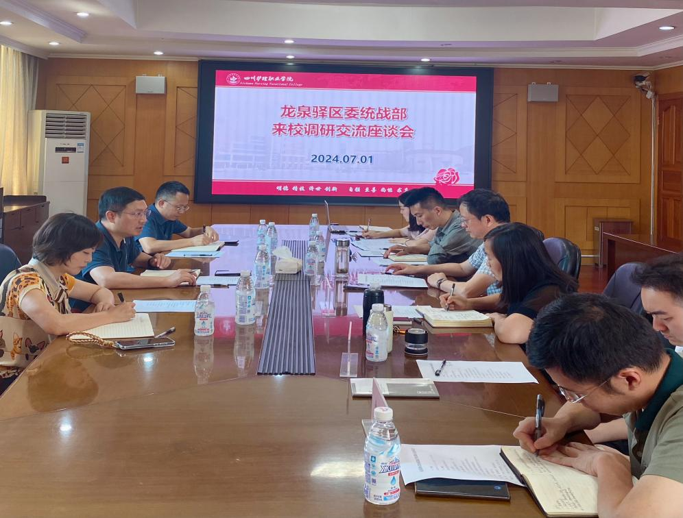 7月1日,龙泉驿区委统战部常务副部长冯宝一行3人来学院开展高校统战工作调研,学院党委书记江涛,党委委员、宣传部部长姚霞等参加调研。