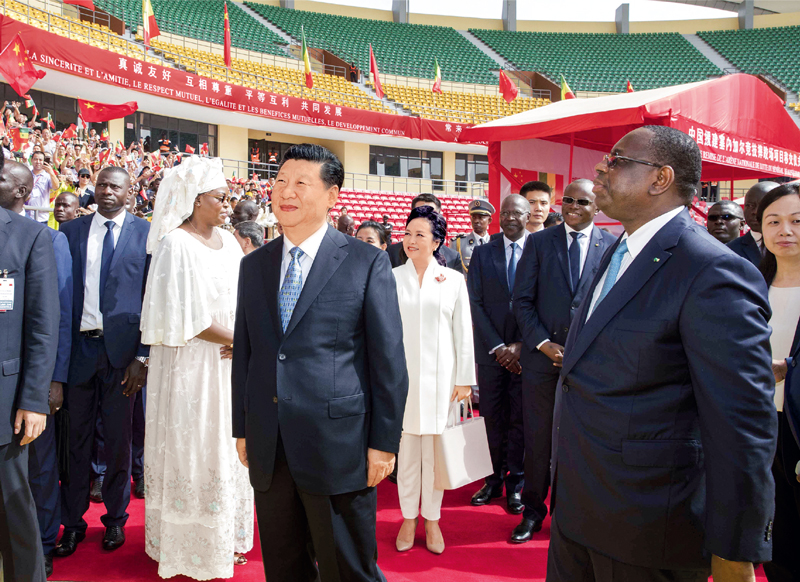 2018年7月22日,国家主席习近平在达喀尔同塞内加尔总统萨勒共同出席塞内加尔竞技摔跤场项目移交仪式。新华社记者 王晔/摄