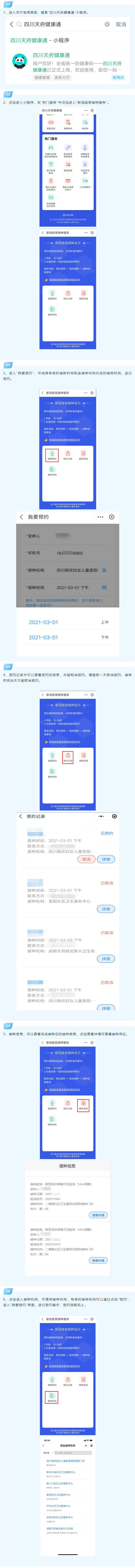 3月1日起“新冠疫苗接种服务小程序”正式上线,自愿接种者可通过该小程序进行新冠病毒疫苗接种预约登记+查询服务。该系统实时掌握各地各机构的新冠疫苗接种信息,实现天府健康通与核酸检测、新冠疫苗预约“一码两系统“的融合,极大提高了新冠疫苗接种效率。除此之外,该系统可与四川天府健康通交互,群众可通过该程序便捷查询疫苗预约进程。