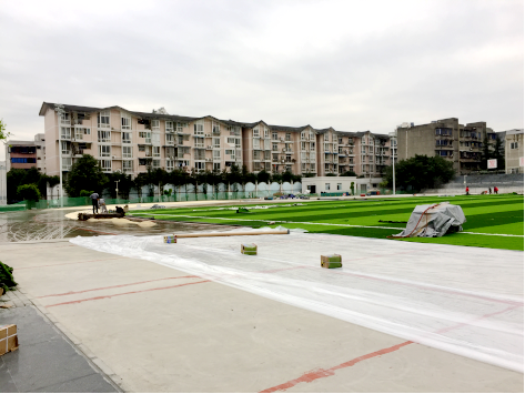 在场地混凝土基础建设达到设计要求并验收合格后开始面层施工,目前优质环保的人工草坪已经“长满”校园足球场地;白色环保塑胶颗粒在工人师傅脚下聚集、铺装粘贴,使跑道变成了白色的“纽带”;同时,省质检站正对施工中所采用的所有材料进行全方位抽检。