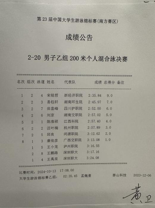 10月11日至10月17日,由中国学生体育联合会主办的2024年第23届中国大学生游泳锦标赛(南方赛区)在贵州遵义成功举办。学院由基础部教师徐人杰带队2020级高职康复1班学生田显峰代表学院参加比赛,以优异成绩勇获200米混合泳季军。