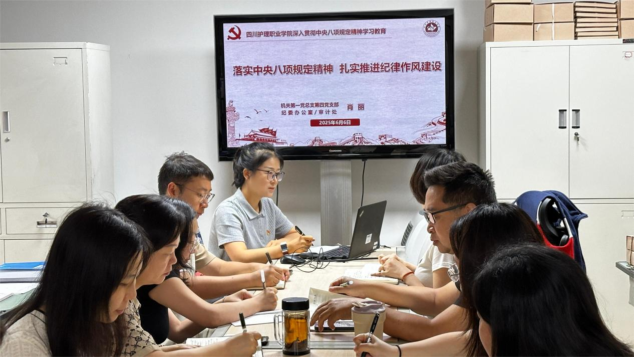 6月6日,学院机关第一党总支第四党支部与机关第二党总支第五党支部联合开展“深入学习中央八项规定精神”主题党日活动。机关第一党总支第四党支部书记、纪委办公室主任肖丽以《落实中央八项规定精神 扎实推进纪律作风建设》为题讲授专题党课。两支部党员参加,纪委办公室、审计处、国资处全体工作人员列席会议。