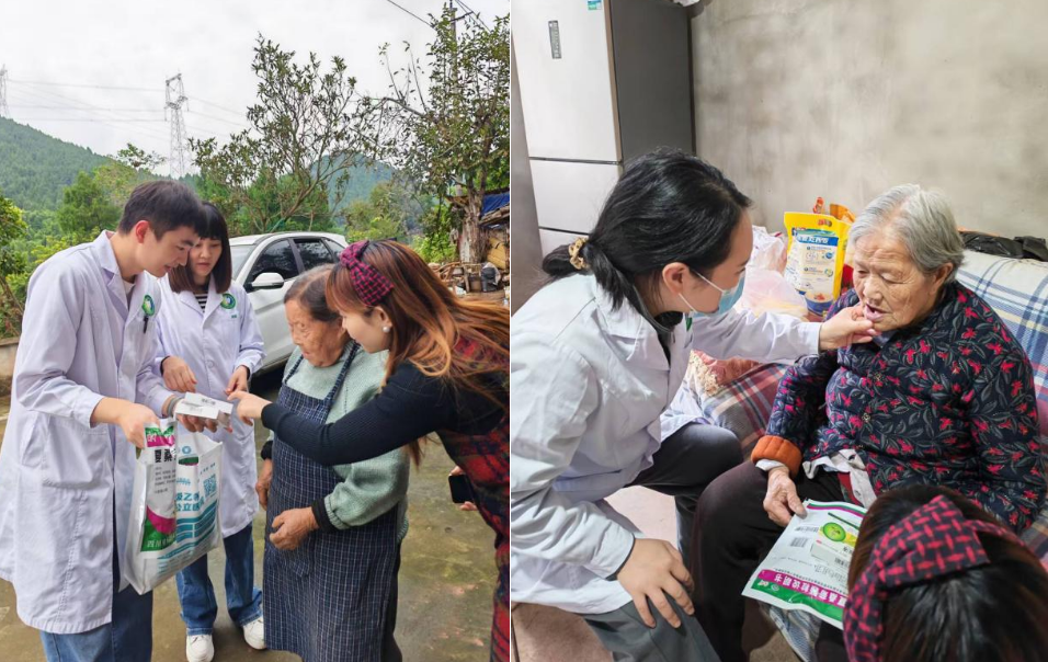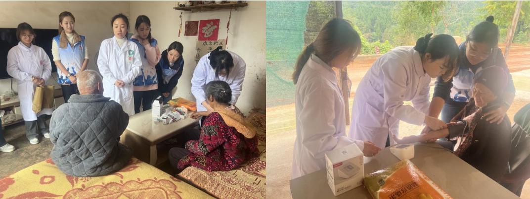 在英雄岭村,由师生志愿者与医院医务人员组成的服务慰问队,分组前往10余户特殊困难老人家庭,开展血压测量、口腔义诊、慢性病管理、卫生打扫等志愿服务。慰问队还送上常用药品和大米等生活物资,改善老人们的生活品质。