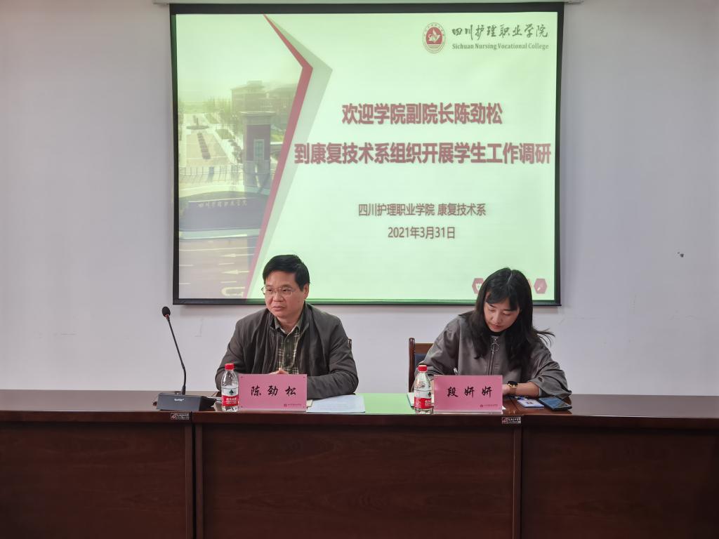 为了加强和规范我院学生管理工作,切实落实“三全育人”机制,全力营造良好育人环境,促进学生健康成长, 2021年3月31日,学院党委委员、副院长陈劲松到康复技术系开展学生工作专题调研,康复技术系主任陈燕彬、康复技术系党总支书记黄萍和全体专兼职辅导员参加调研会。