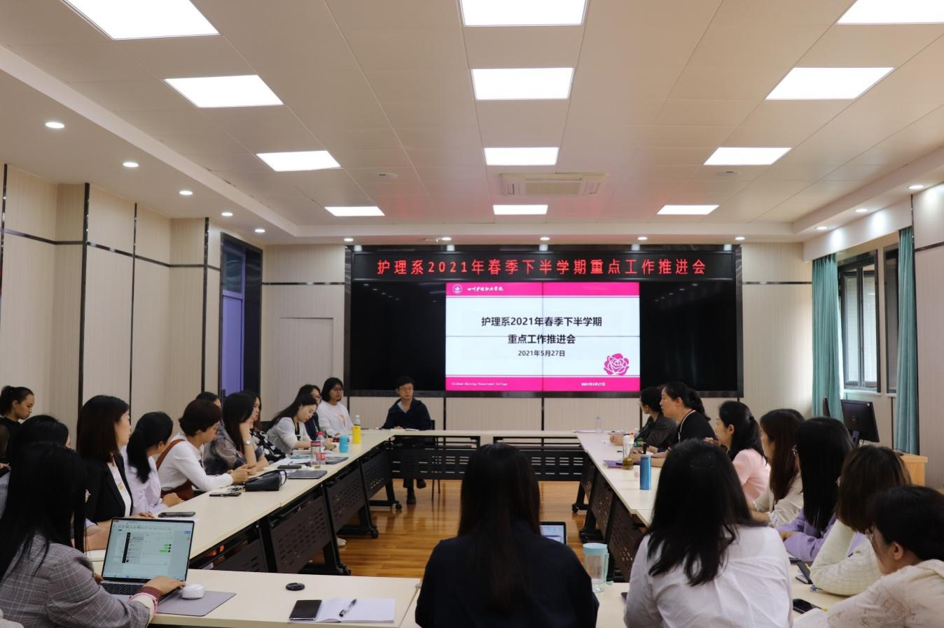 2021年5月27日下午,护理系在德阳校区召开2021年春季下半学期重点工作推进会。系主任邓小利、党总支书记黄鸷、副主任苗泓丽、副主任淳玲出席会议,各教研室主任和秘书、部分教师、行政人员和辅导员代表参会。会议由邓小利主持。