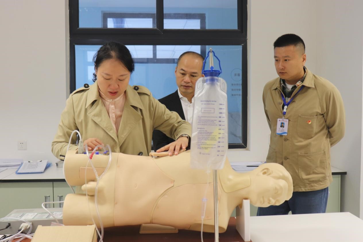 随后,徐建山一行参观了沉浸式实训室、穿刺实训室、模拟手术室、模拟产房、妇产科护理实训室、母婴餐饮制作室、儿科护理实训室、儿保早教室、急救实训室等。在参观过程中,参观人员就实训基地建设、授课流程、理论与实践的结合等问题与陪同人员进行了充分交流,为开展进一步合作奠定了良好基础。