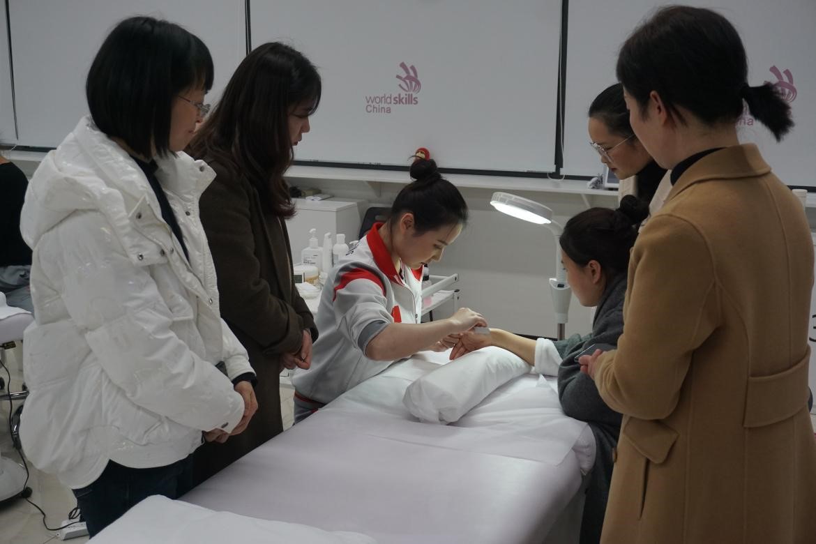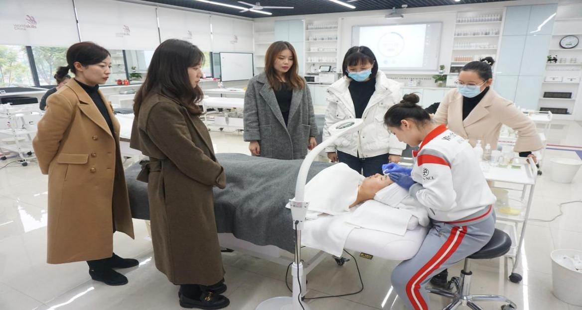 随后,在世界技能大赛美容项目中国专家组组长王芃及第45届世界技能大赛美容项目银牌获得者、世界技能大赛美容项目教练李真芹的陪同下,参观了世赛美容训练基地,并现场观摩了世赛选手的训练。