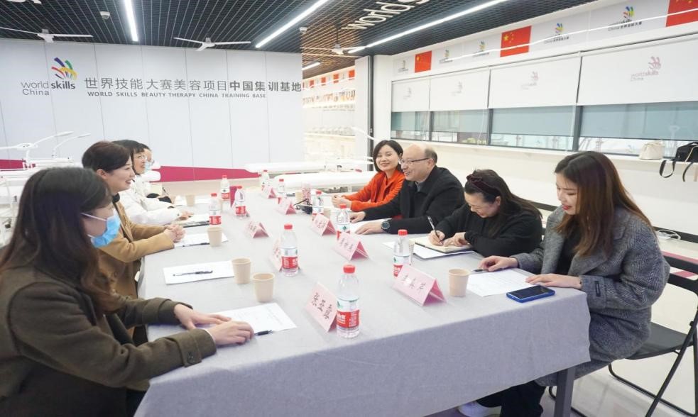 重庆城市管理职业学院文化与旅游学院院长、党总支副书记柏文涌,世界技能大赛美容项目中国专家组组长王芃及世界技能大赛美容项目教练刘嘉嘉、李真芹等热情接待考察组一行。柏院长就重庆城市管理职业学院的概况及美容项目世赛办公室在世赛选手训练、国际标准开发、教材开发等方面所取得的成果作简要介绍;王院长详细介绍了香港蒙妮坦集团公司与学校合作成立的重庆蒙妮坦形象设计学院的典型校企合作案例,由企业投入资金在学校建立形象设计、发型设计、美容美体等项目实训中心,实施校企协同育人的发展历程。周佳丽主任简要介绍了我院的概况,并就我院医学美容技术专业的设立、专业人才培养定位及职业面向、教学团队、课程设置、学生培养、专业实训基地建设、联盟与合作等七个方面进行了详细介绍。双方还就医学美容技术专业的发展现状、专业教学理念、专业发展面临的瓶颈、专业群发展的新方向等问题展开了深入沟通。