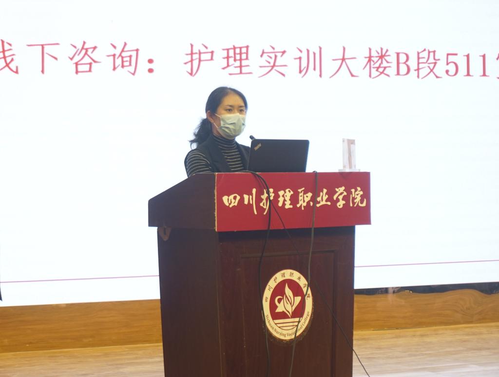 本次宣讲会由护理系教学科科长李月梅主持,她主要介绍了口腔护理现代学徒制订单班的背景、具体教学开展的模式、学生加入订单班的教学安排三个方面的内容。