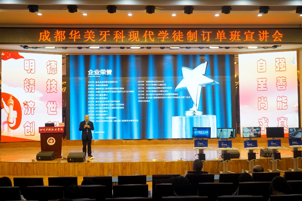 在宣讲会上,荣长根总经理介绍了成都华美牙科的口腔领域、业务范围、人才发展和业务路径、牙医护士的工作内容,播放了视频《口腔护士的一天》,让学生更直观地观看和体会到了口腔护士的工作日常。公司专注于牙科产业平台搭建,通过对接牙科器材厂商以及牙科诊所,建立高效供应链,服务于整个口腔产业。