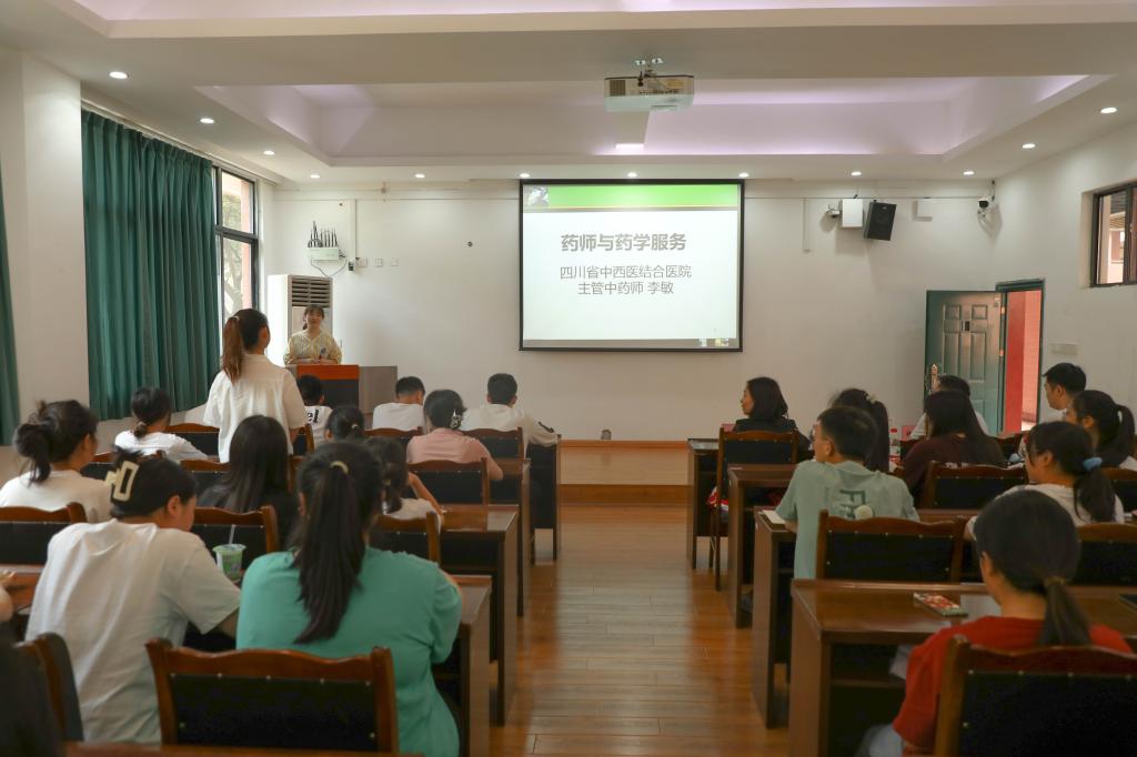 本次就业大讲堂由四川省中西医结合医院主管中药师李敏作交流分享,她详细介绍了药师与药学服务,同时就药学专业在医院的就业前景与同学们进行了现场交流。