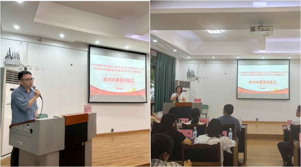 深入贯彻落实党的二十大精神,充分发挥党建引领作用,推进康复技术系党总支与龙泉平安社区卫生服务中心党支部的全方位合作,6月25日,康复技术系党总支在学院成都校区与龙泉平安社区卫生服务中心党支部举行结对共建签约仪式。双方党组织书记和全体党员参加了此次活动。活动由康复技术系党总支书记黄萍主持。