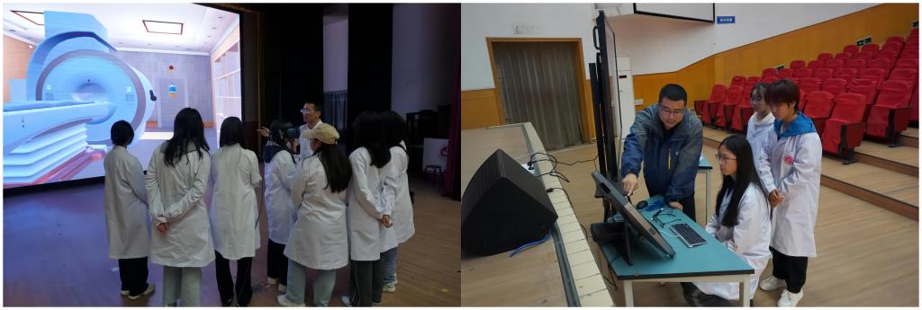 体验环节,通过沉浸式VR体验医院放射科虚拟场景,同学们对医院医学影像中心布局及设备功能有真实的体验和深入的认知。同时,根据操作引导了解了患者就医流程和影像检查流程。通过桌面VR设备同学们体验了大型影像设备逼真的结构认知、拆装;活动过程中,同学们全神贯注,热情高涨。