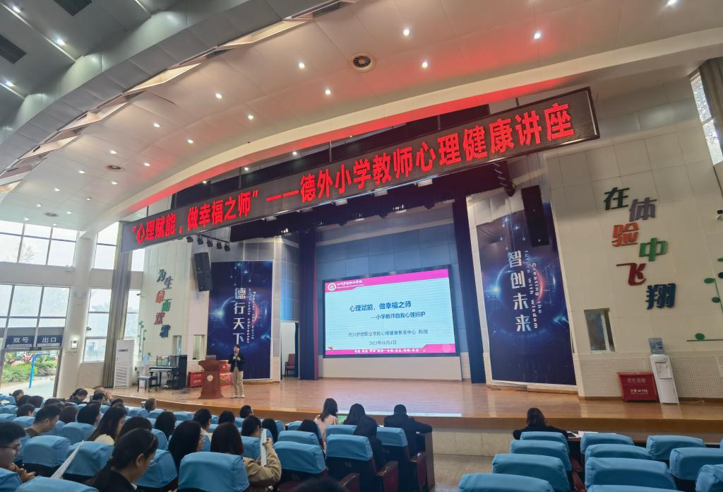 二是举行心理讲座,心贴心交流。心理健康中心副教授陈旭为德阳外国语小学100余名教师做“心理赋能,做幸福之师”心理健康专题讲座。针对小学教师群体的心理健康情况,陈旭详细讲解了情绪压力产生的原因,以及疏导心理的具体措施,为老师们减压赋能提供方向。